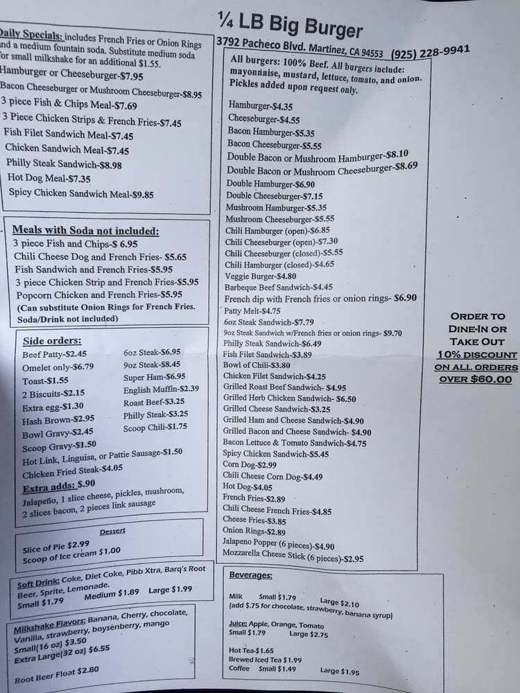 1/4 Lb Big Burger is a hidden gem known for its mouth-watering burgers and friendly service. Located in Martinez, CA, this American diner offers a variety of options for breakfast, brunch, lunch, and dinner. Customers rave about the generous portions and fresh ingredients. John B. praises the burgers and fries as the best he's had, while Bay M. and Scott L. highlight the delicious mushroom burger, bacon cheeseburger, and fish and chips. The menu also includes side orders like hash browns, steak, and English muffins. With a cozy diner vibe and attentive staff, 1/4 Lb Big Burger is the perfect spot for a satisfying meal. Whether you're craving a classic bacon cheeseburger or a hearty plate of fish and chips, this diner has something for everyone. Don't miss out on this local favorite for a taste of authentic American cuisine.
